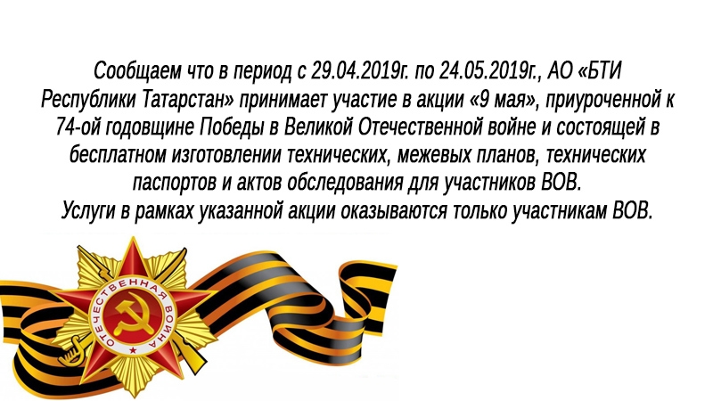 Сообщаем что в период с 29.04.2019г. по 24.05.2019г., АО «БТИ Республики Татарстан» принимает участие в акции «9 мая», приуроченной к 74-ой годовщине Победы в Великой Отечественной войне и состоящей в бесплатном изготовлении технических, межевых планов, технических паспортов и актов обследования для участников ВОВ.