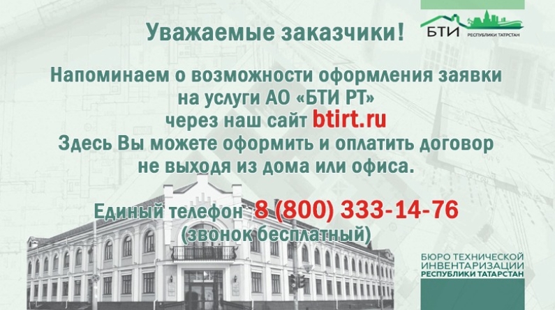 Для оформления договора перейдите на ПОРТАЛ УСЛУГ АО "БТИ РТ" выберете необходимую услугу оформите и оплатите заявку без посещения офиса.