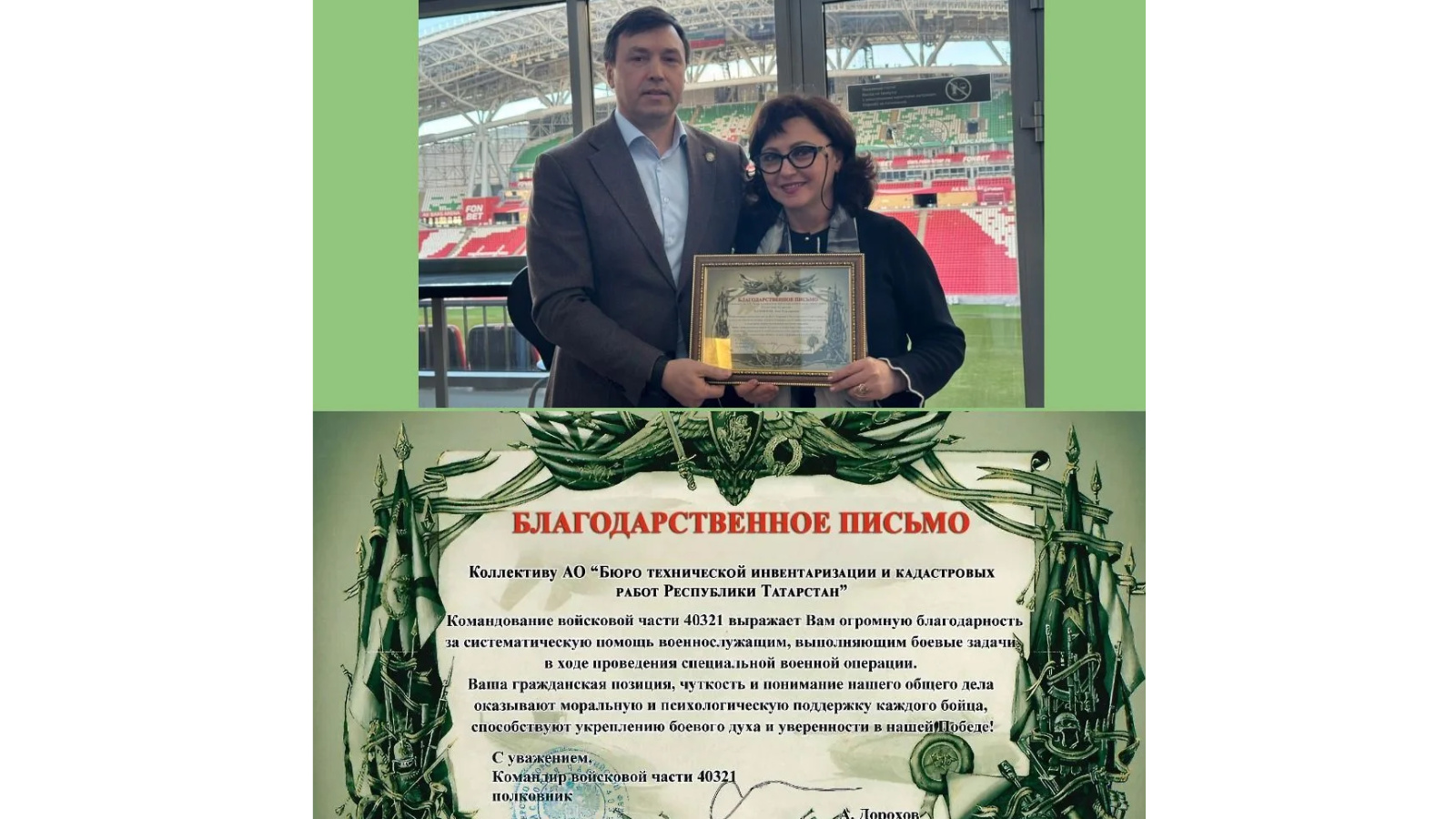 8 декабря министр земельных и имущественных отношений Республики Татарстан Аглиуллин Ф.А. поблагодарил коллектив АО «БТИ РТ» за оказываемую поддержку и помощь участникам специальной военной операции и передал генеральному директору АО «БТИ РТ» Хамзиной Л.И. Благодарственное письмо от командира войсковой части А.Дорохова за систематическую помощь и поддержку военнослужащим, выполняющим боевые задачи в ходе проведения специальной военной операции.